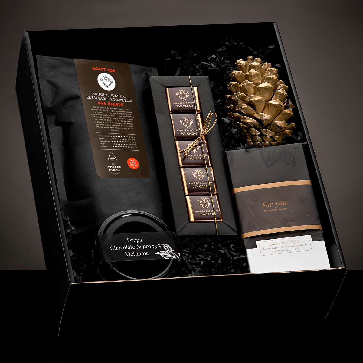 Cabaz gourmet que combina o verdadeiro chocolate e café de qualidade, numa experiência equilibrada, intensa e cheia de prazer.